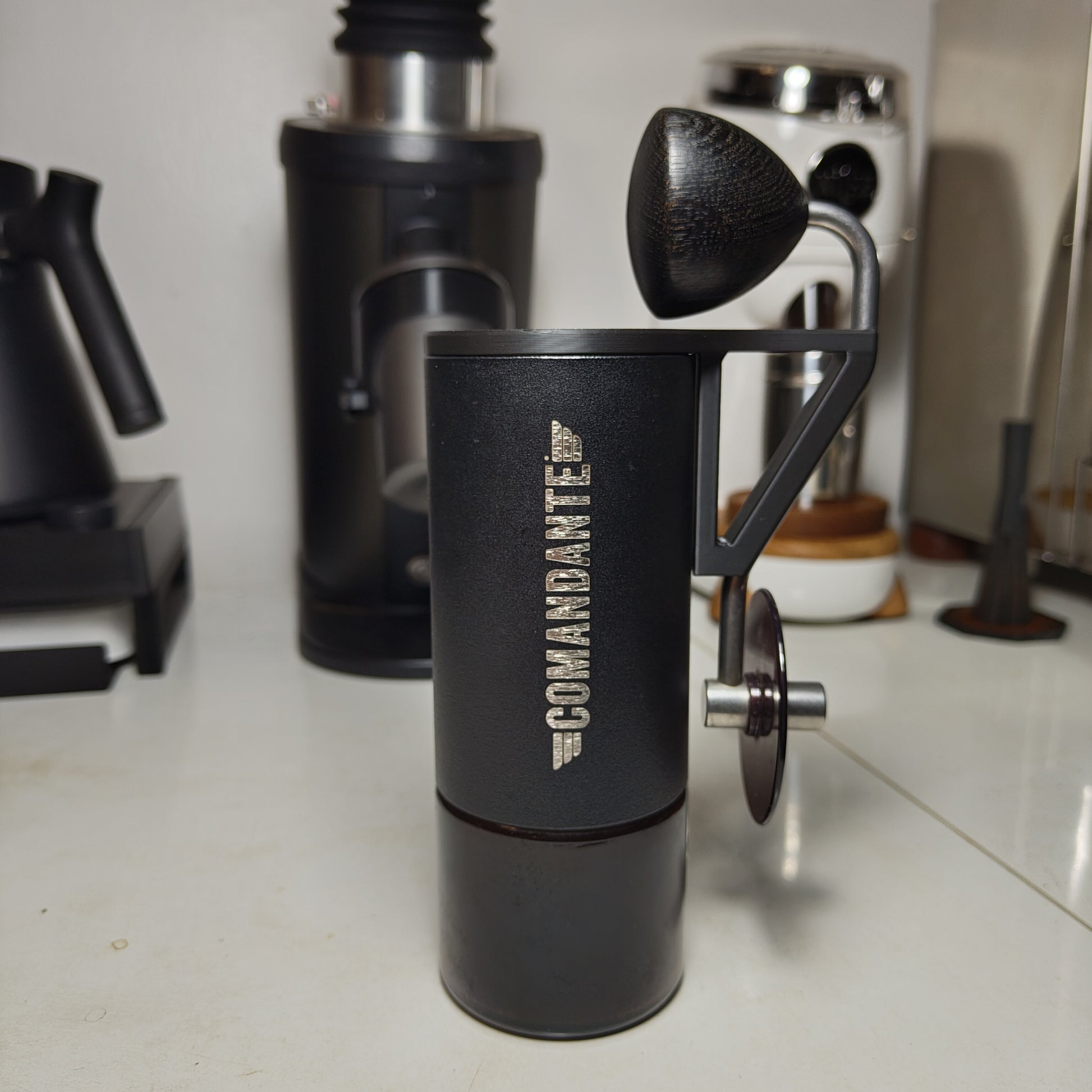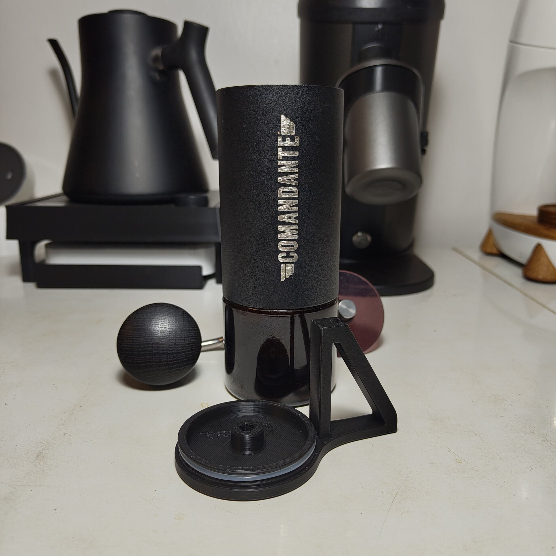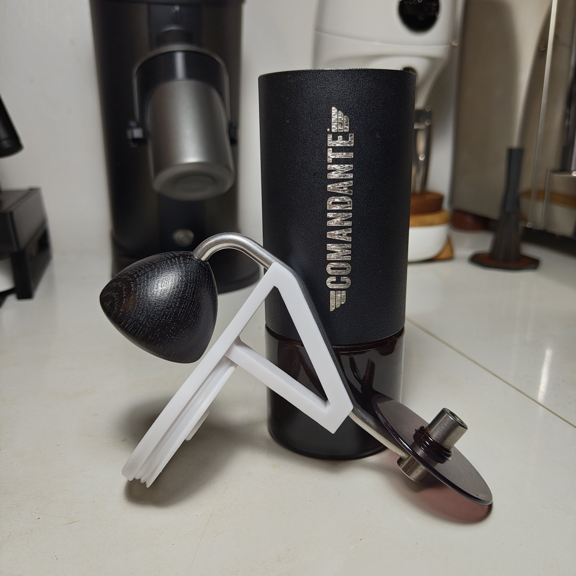 Introducing Capello, the precision-designed lid exclusively crafted for the Comandante coffee hand grinder. Elevate your coffee experience with this purpose-built accessory, ensuring secure and convenient stowage of your grinder crank. Tailored for Perfection Capello boasts a bespoke design meticulously tailored for the Comandante grinder, featuring tight tolerances for a snug and secure fit. Its silicone O-Ring ensures the entire assembly stays firmly in place, providing peace of mind during storage and transportation. Smart and Practical Features The hexagonal hole at the center of the lid serves a dual purpose – it securely holds the burrs in place for safe transport while maintaining the grinder's integrity. The crank holder, uniquely shaped to conform with the crank profile, ensures a snug snap-fit, facilitating easy daily use. Functional Design, Unobstructed View Designed with a triangular frame, the crank holder not only secures the crank but also maintains maximum visibility. Capello preserves an unobscured view behind the hand grinder, ensuring a seamless and uninterrupted coffee brewing ritual. Durable and Reliable Material Crafted from PLA+, a durable and robust material, Capello guarantees longevity and reliability. Its high-quality construction ensures lasting performance, adding a touch of sophistication to your Comandante grinder setup. Upgrade Your Coffee Ritual Enhance your Comandante coffee hand grinder with Capello, the ultimate lid engineered for secure crank stowage. Embrace convenience and precision in every aspect of your coffee journey with this thoughtfully designed accessory. * Grinder not included, pictures for illustration only