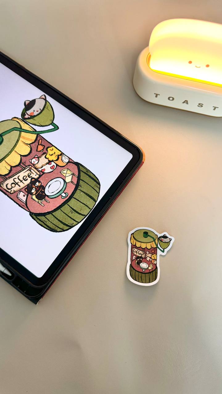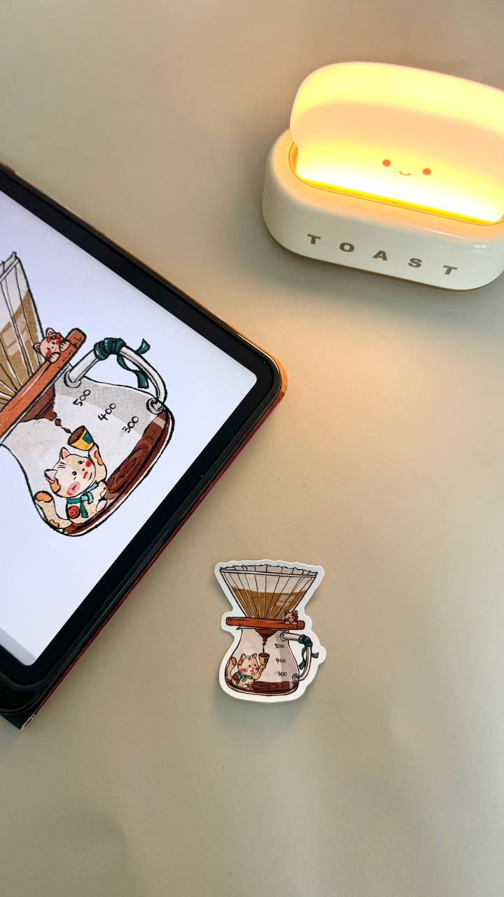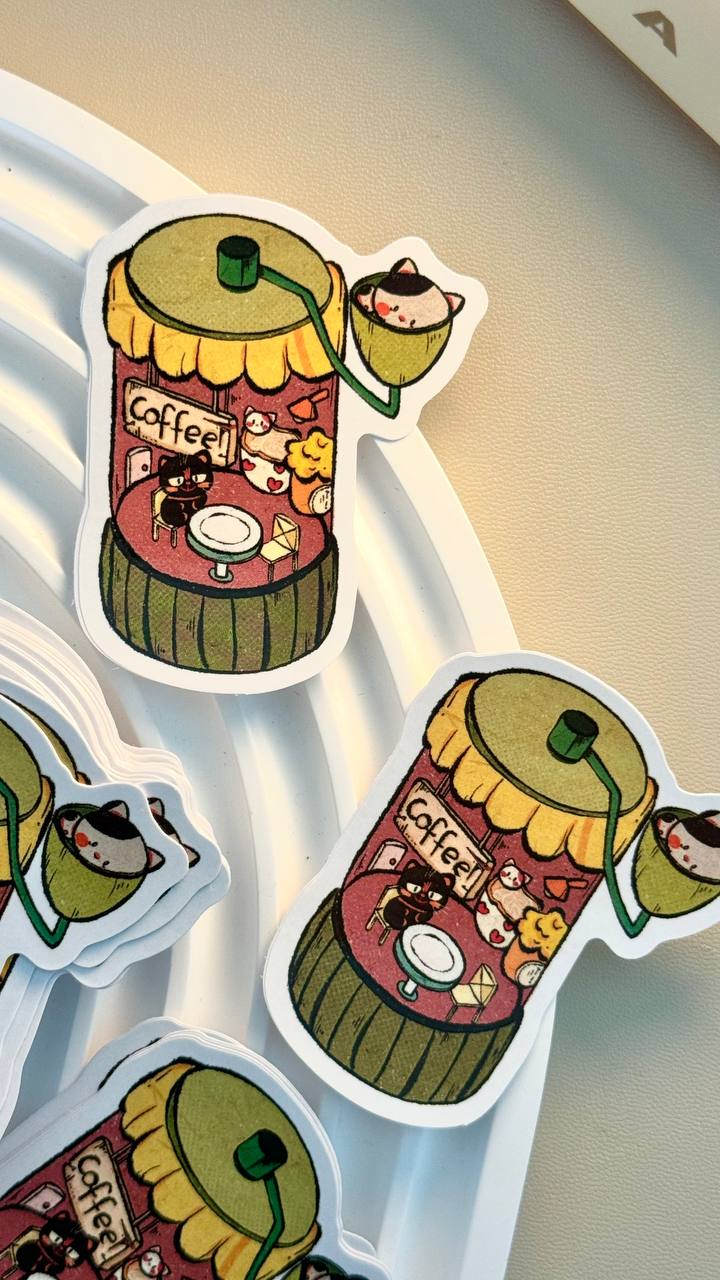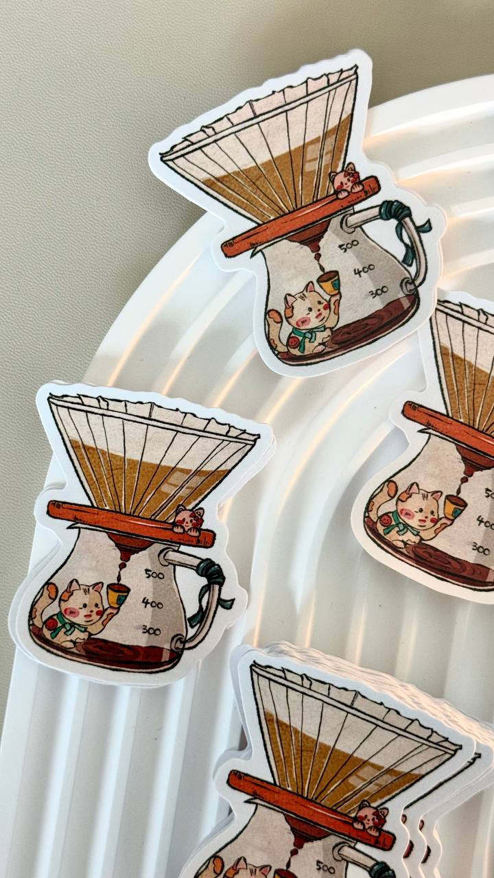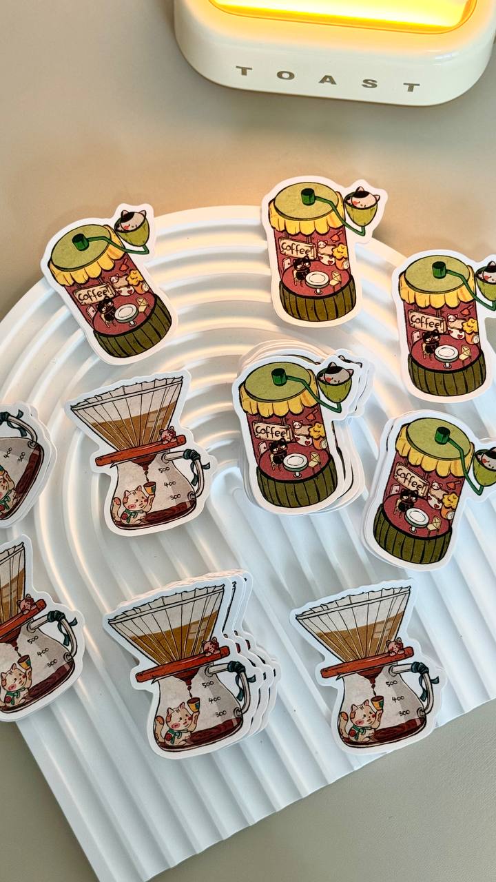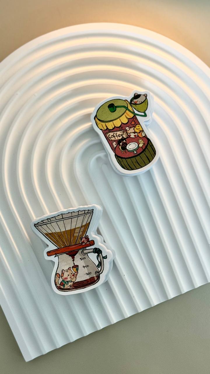 Coffee-Themed Cat Stickers designed in collaboration with local artist, @iwasframedd, based on different coffee-related equipment, namely the C40 grinder design and V60 dripper.