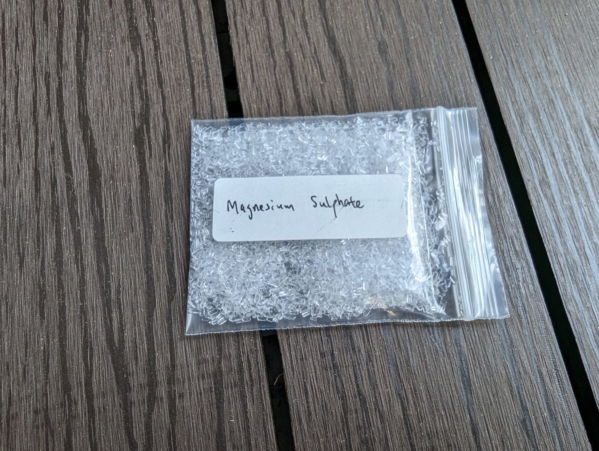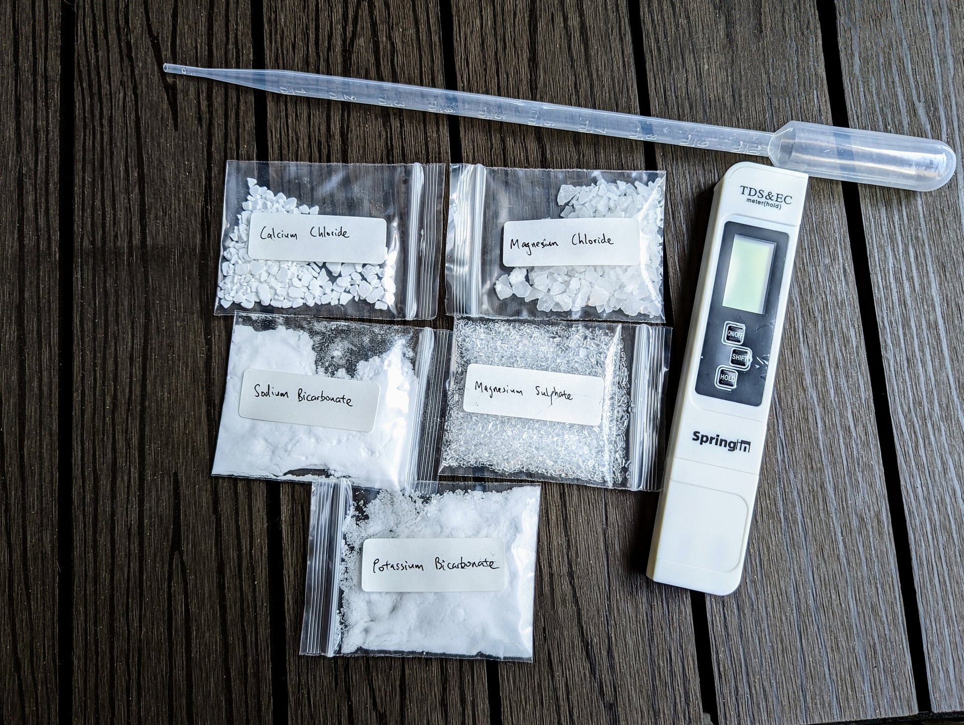 1. 5 bags of pre-weighted minerals of which 3 are 'hardness' sources (Magnesium Sulphate, Calcium Chloride, Magnesium Chloride), 2 are 'alkalinity sources' (Potassium Bicarbonate, Sodium Bicarbonate). They are 100% pure and food grade, sourced from health supplements and baking supplies.