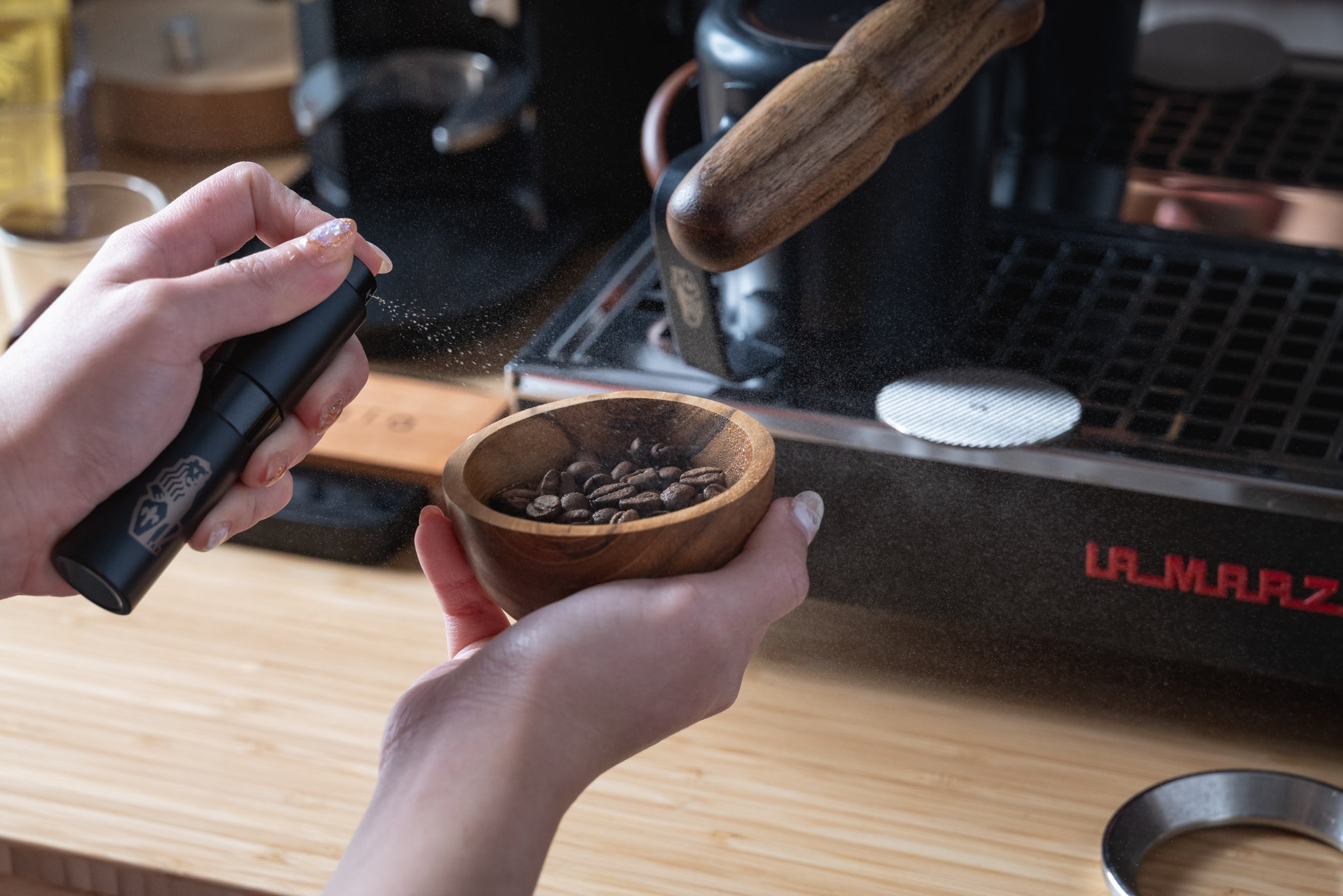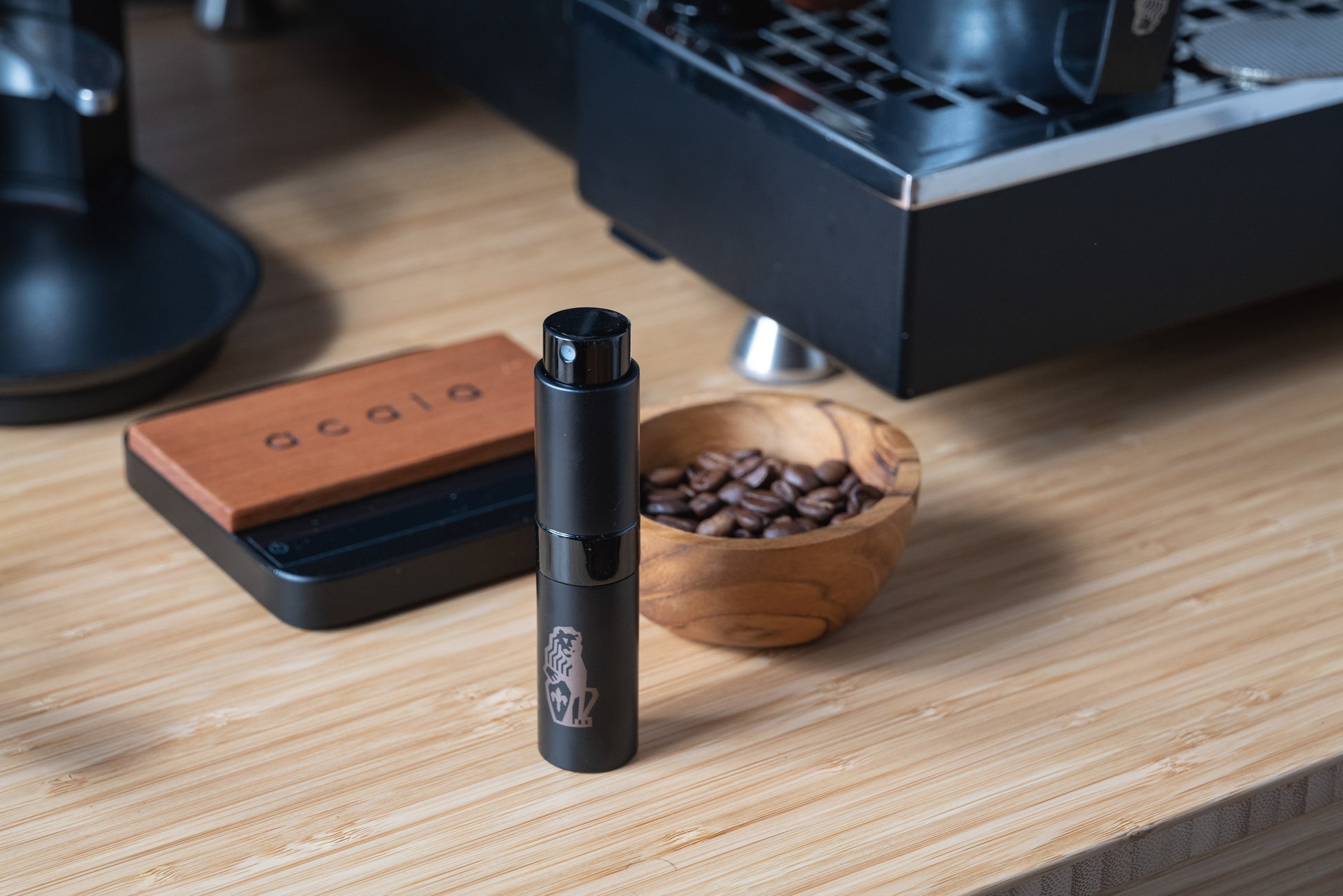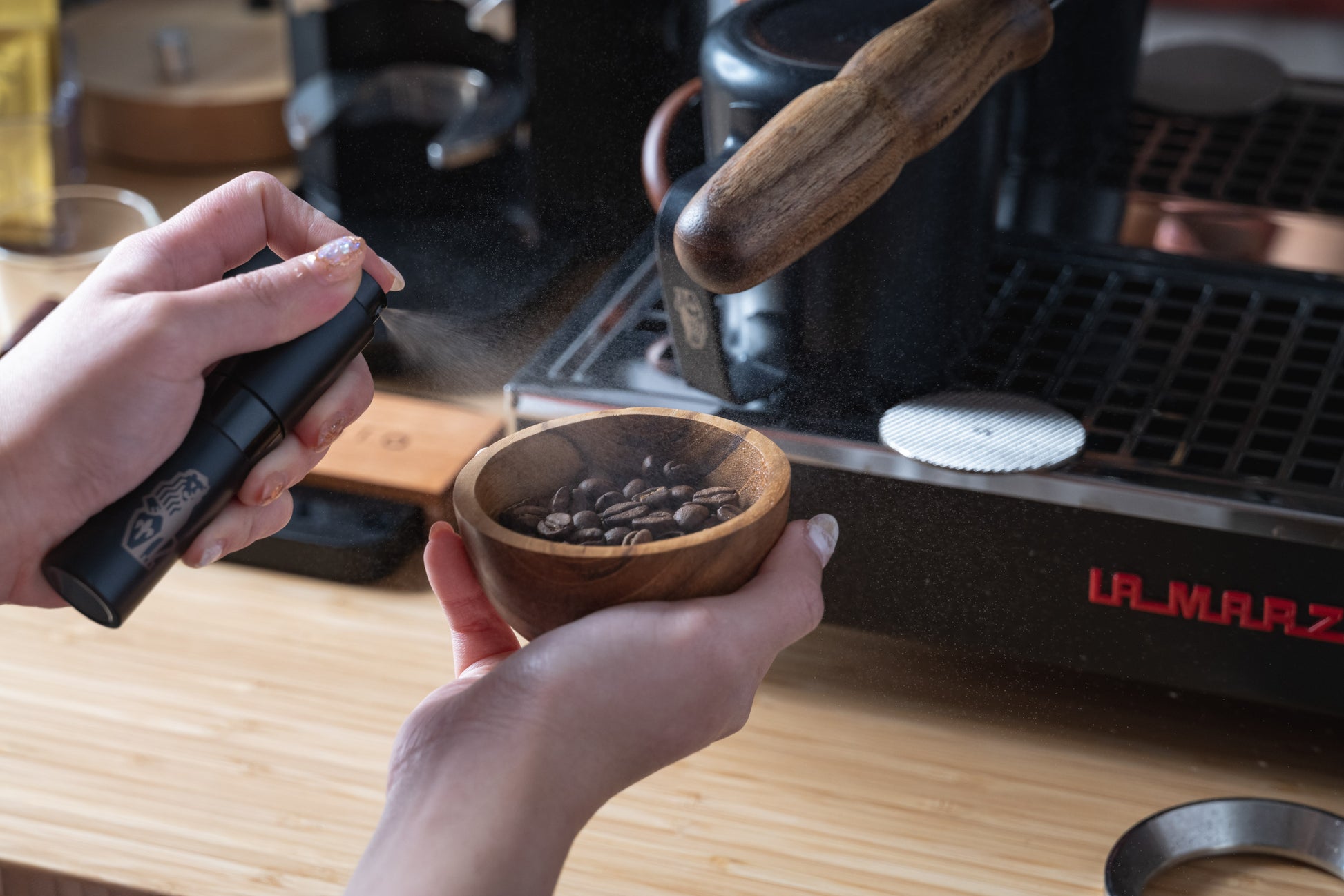 RDT (Ross Droplet Technique) bottle spray made in metal with plastic accent and twist cap. Spray 1 or 2 times onto your beans and give them a good shake before grinding to reduce static on coffee grounds. Especially useful for single dosing. No more flying grounds and chaff over your countertop.