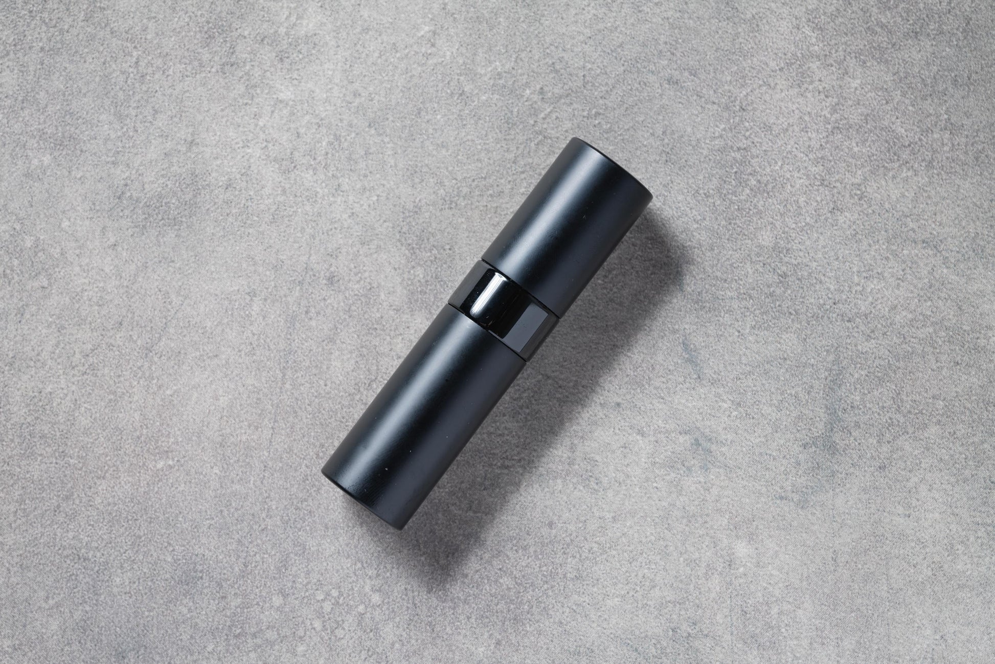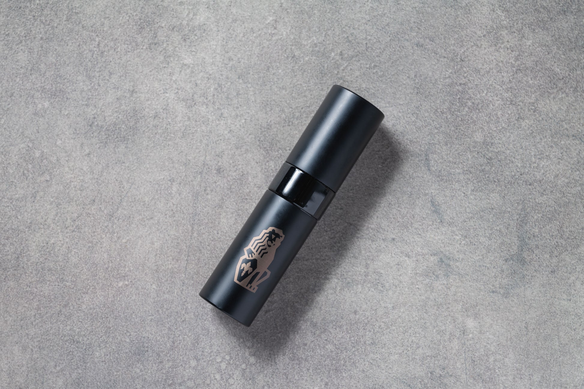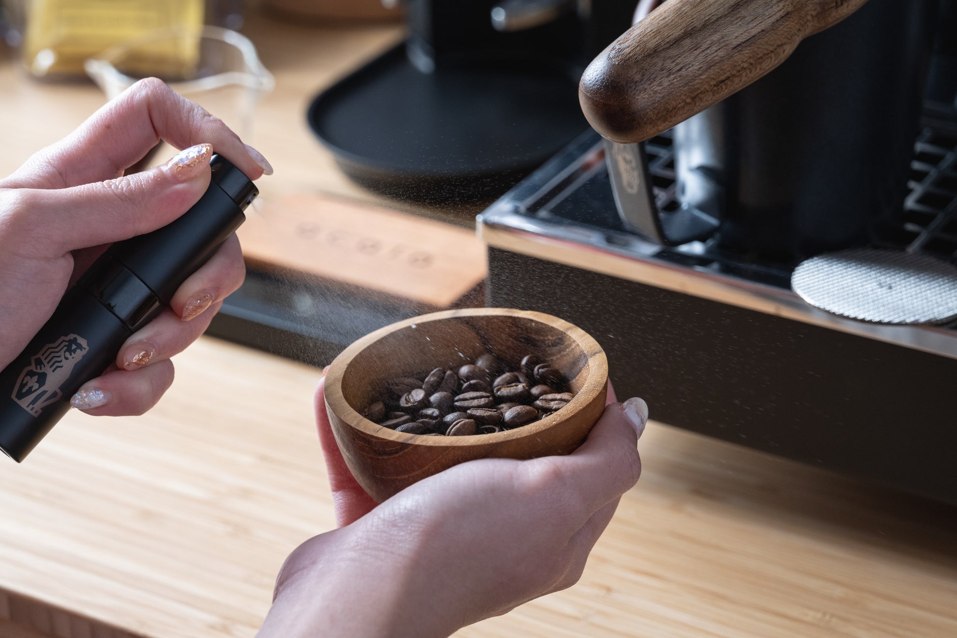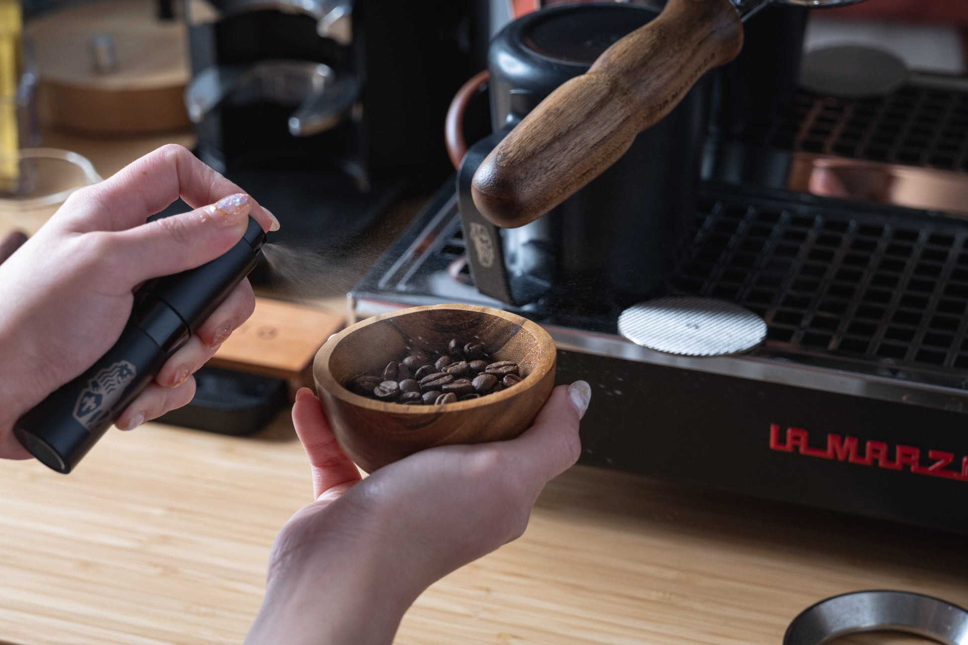 RDT (Ross Droplet Technique) bottle spray made in metal with plastic accent and twist cap. Spray 1 or 2 times onto your beans and give them a good shake before grinding to reduce static on coffee grounds. Especially useful for single dosing. No more flying grounds and chaff over your countertop.